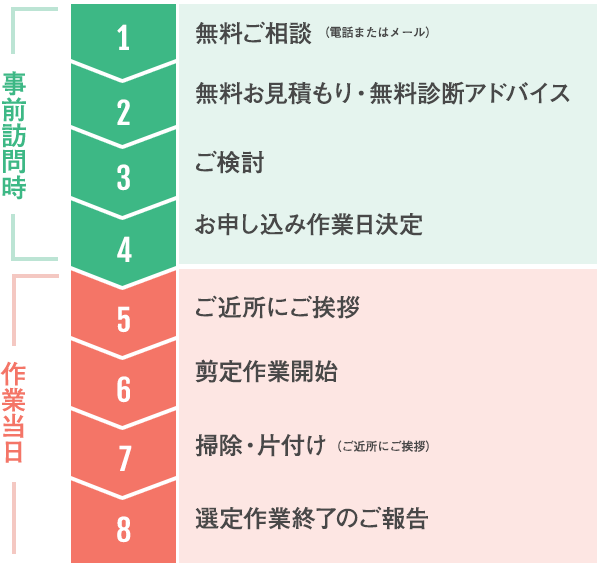 剪定のスケジュールは事前にお打ち合わせの上、日時を決めさせていただきます。「いつ来るかわからない」「いつ終わるかわからない」といったことはございません。